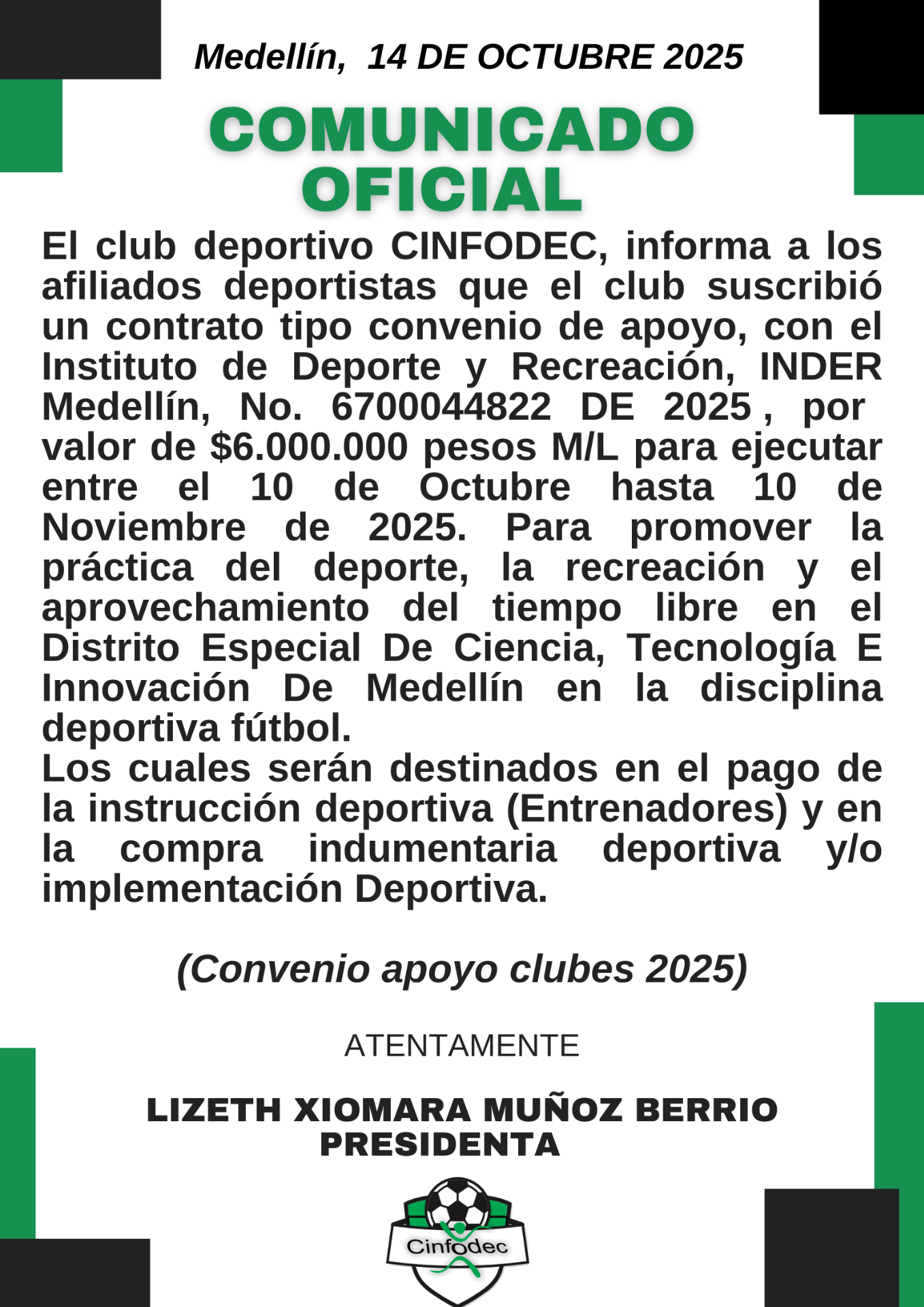 Para el club es muy importante el apoyo recibido, Agradecemos al INDER por contribuir al desarrollo de nuestra actividad deportiva. CONVENIO No. 6700044822 DE 2025